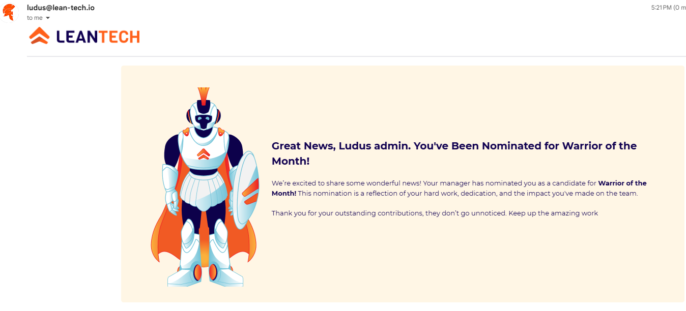 Notifications when employees are nominated for "Warrior of the Month" awards, fostering recognition and engagement.